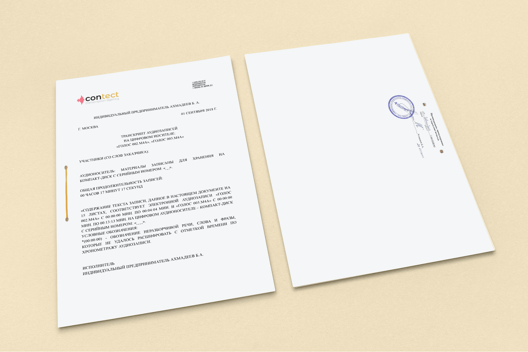 Our agency provides a certification service for our transcripts prepared from the records of your negotiations, court sessions, telephone conversations for attachment to the lawsuit.